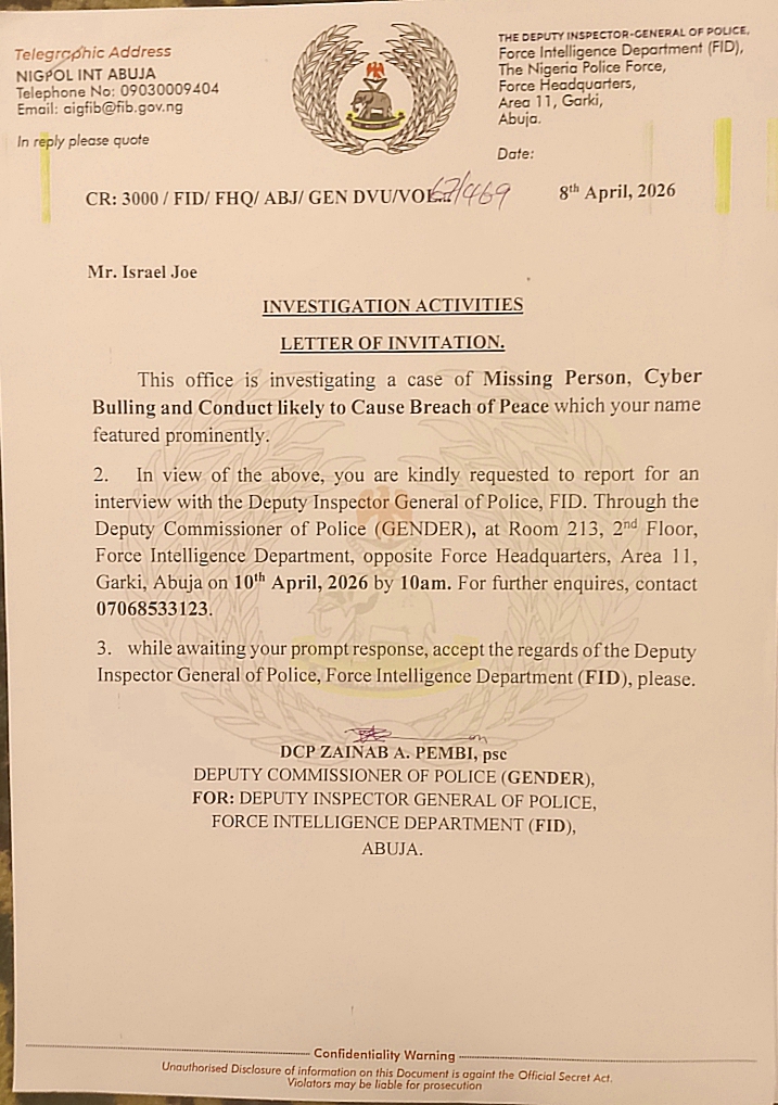 The Force Intelligence Department (FID) of the Nigeria Police Force has invited human rights activist, Israel Joe, for interrogation, citing allegations bordering on a case of a missing person, cyberbullying, and conduct likely to cause breach of peace. In a letter dated April 8, 2026, and referenced CR: 3000/FID/FHQ/ABJ/GEN DVU/VOL DVU/VO2/469 21469, the police said […]